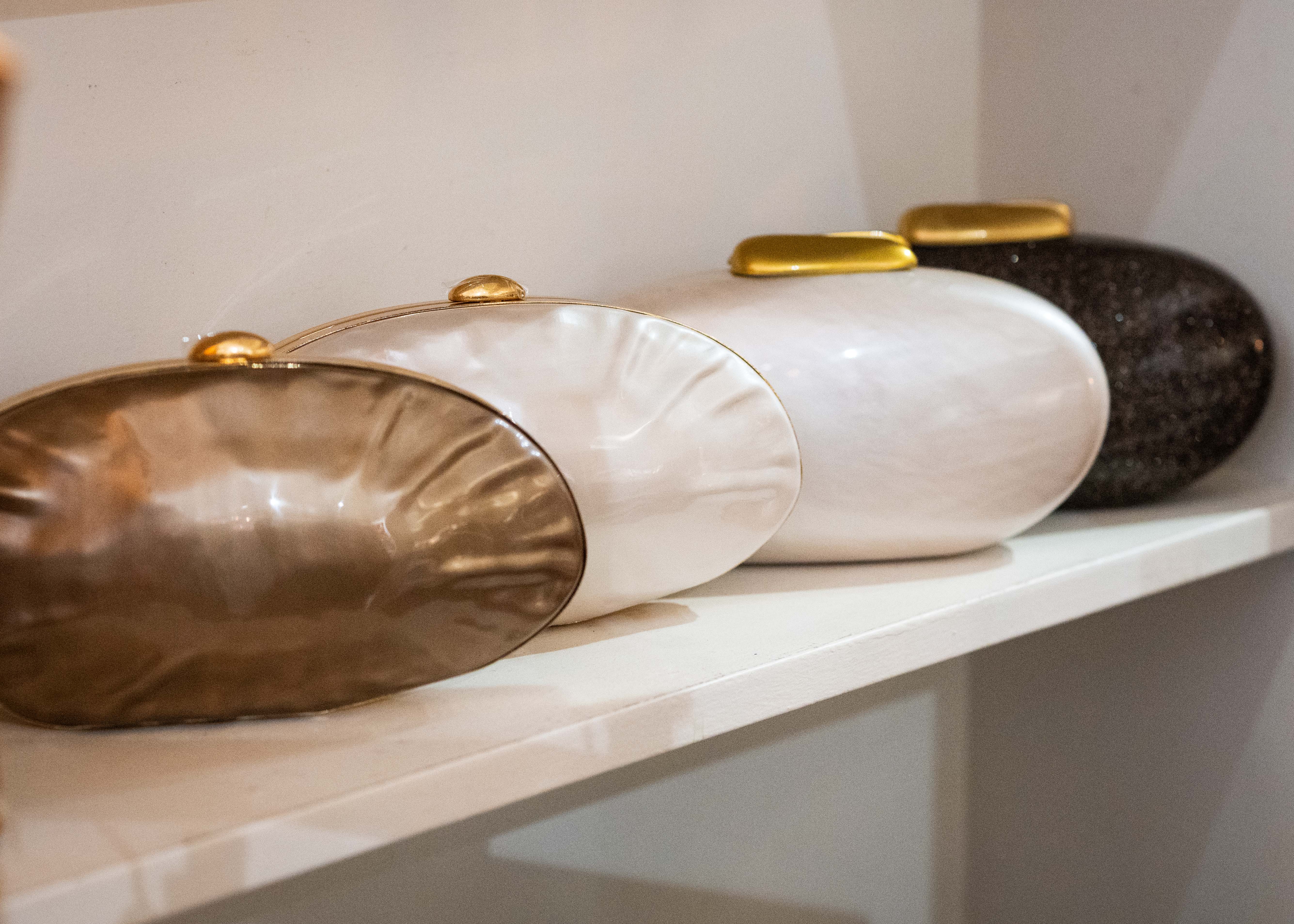 Hard shell oval clutch featuring a soft shell-like design, a gold metal opening surround and an oval gold top opening clasp.  Available in beige and brown.