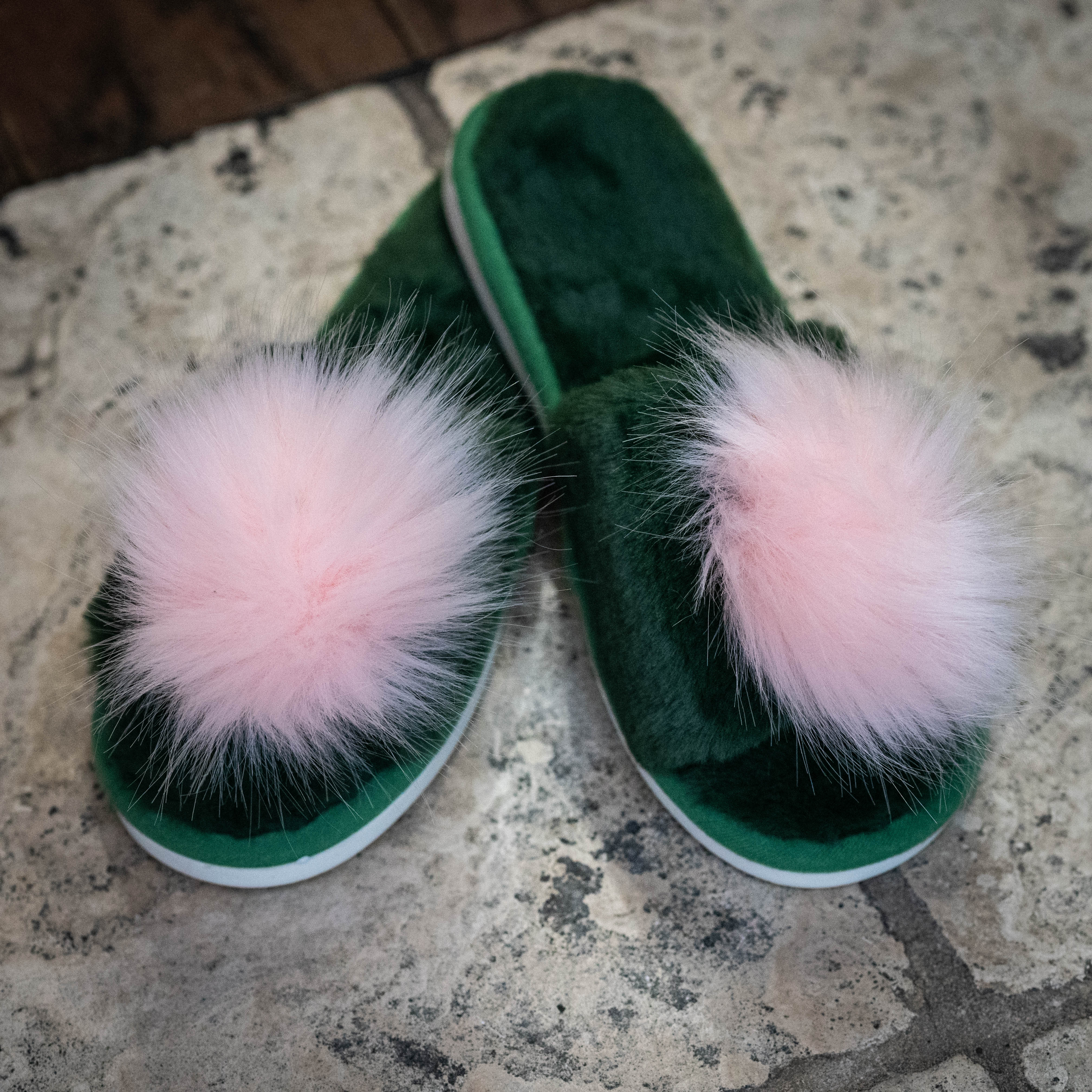 Velvety soft slip on slippers with large soft pompoms.  Available in dark green with pink and red.
