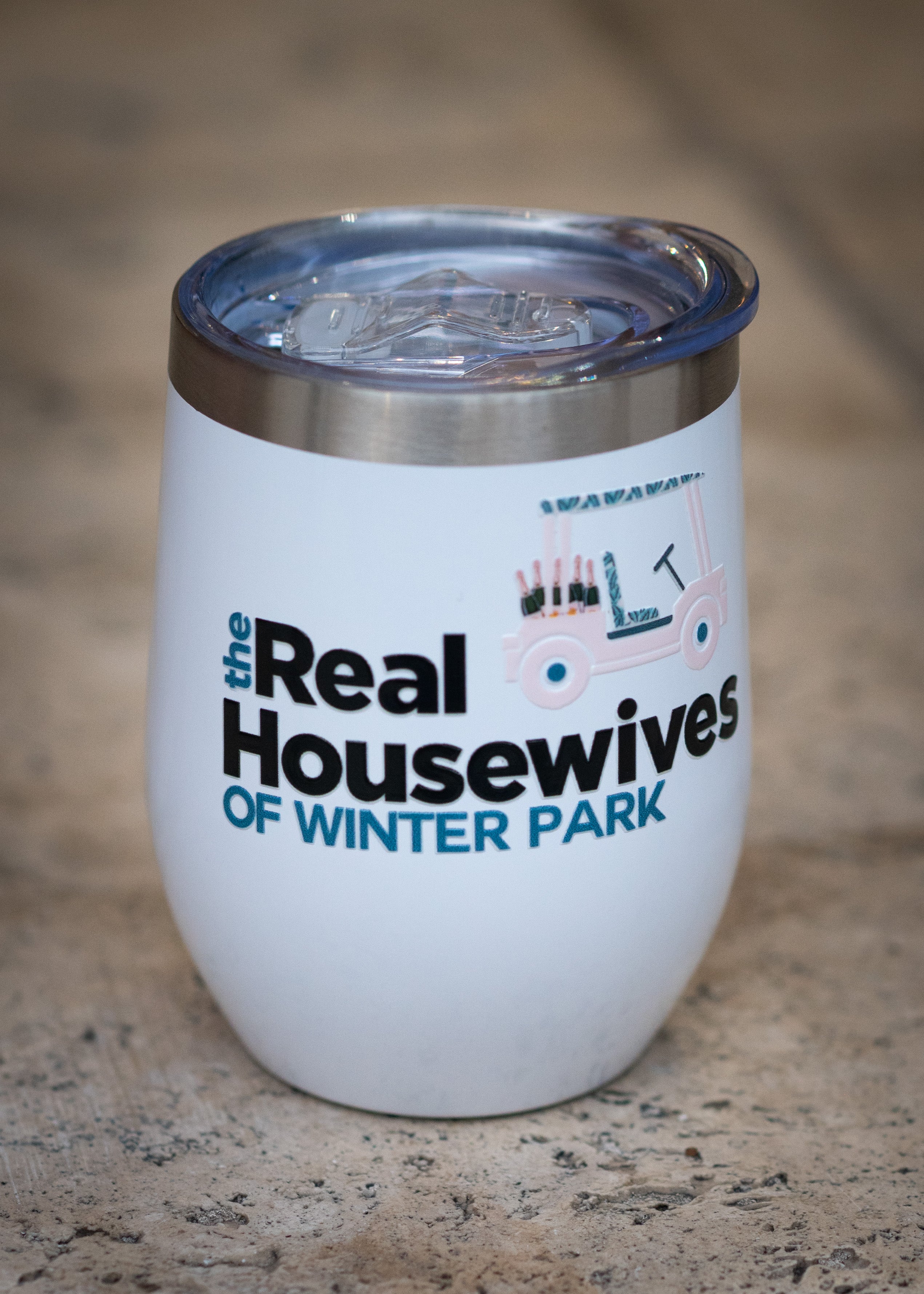 Traveler cocktail metal insulated cup featuring a white background, "Real Housewives of Winter Park" wording and a pink and green open electric golf cart with pink champagne bottles accent.