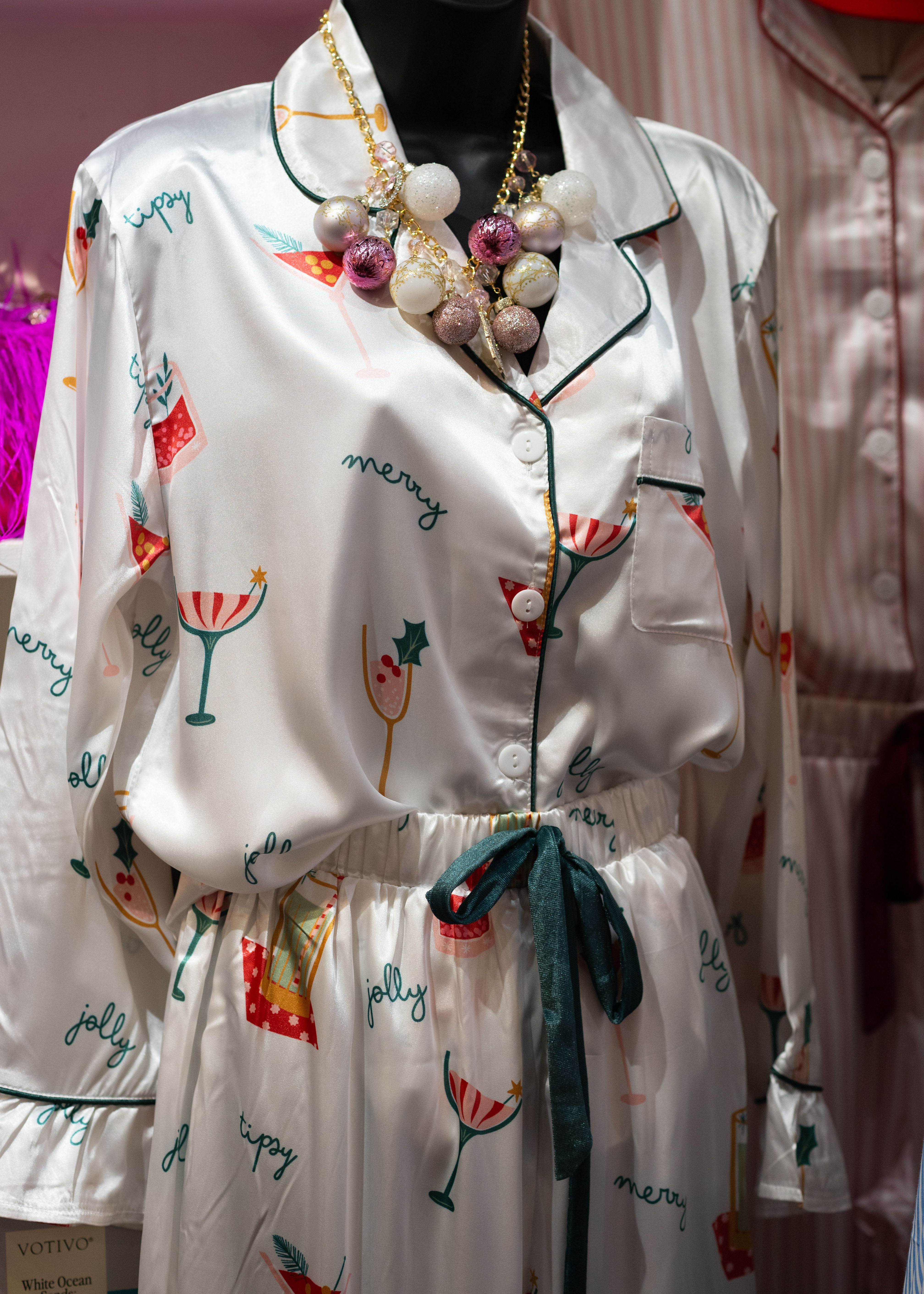 Ladies festive holiday pajamas feature a white satin button front top and full elasticized pants with pink, red and white cocktail motif.