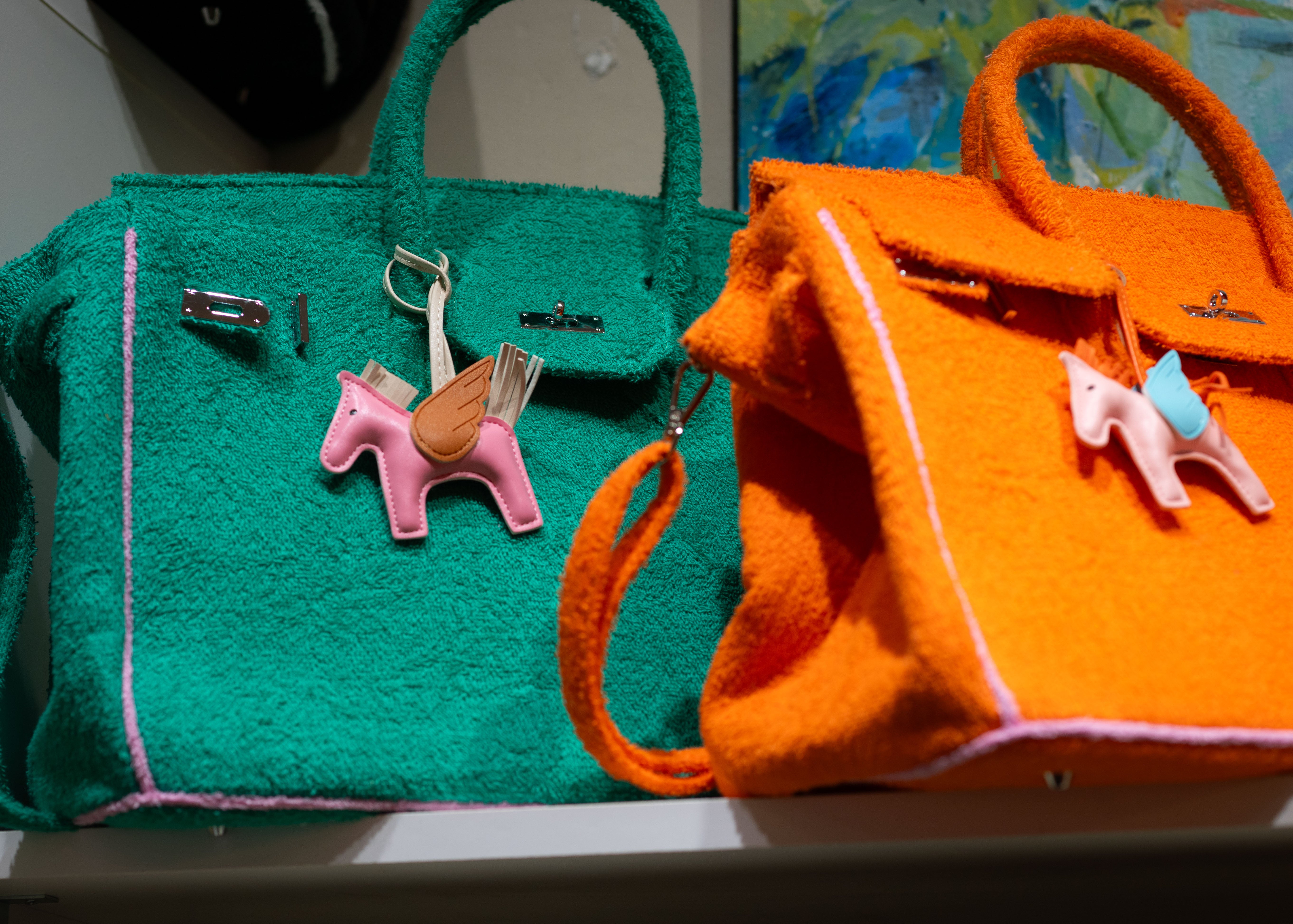 Large terry cloth tote with double top handles, and small front flap with metal closure.  Side and base detailing includes accent contrast piping, metal studs, and a winged stuffed pony dangling tag.  Available in black & white, turquoise & pink, and orange & pink.