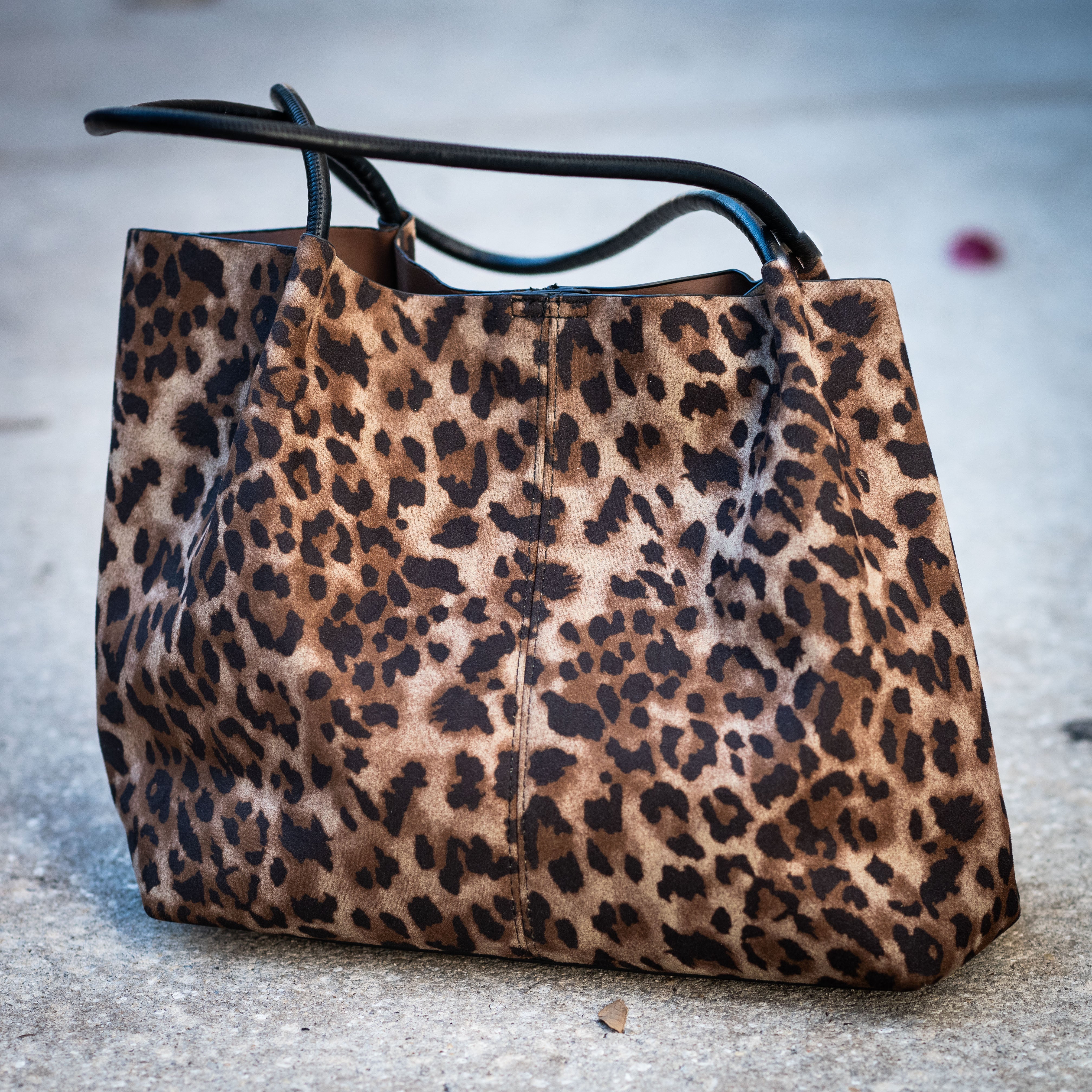 Large tote in leopard print on microfiber suede features two dark brown straps and an interior pouch.
