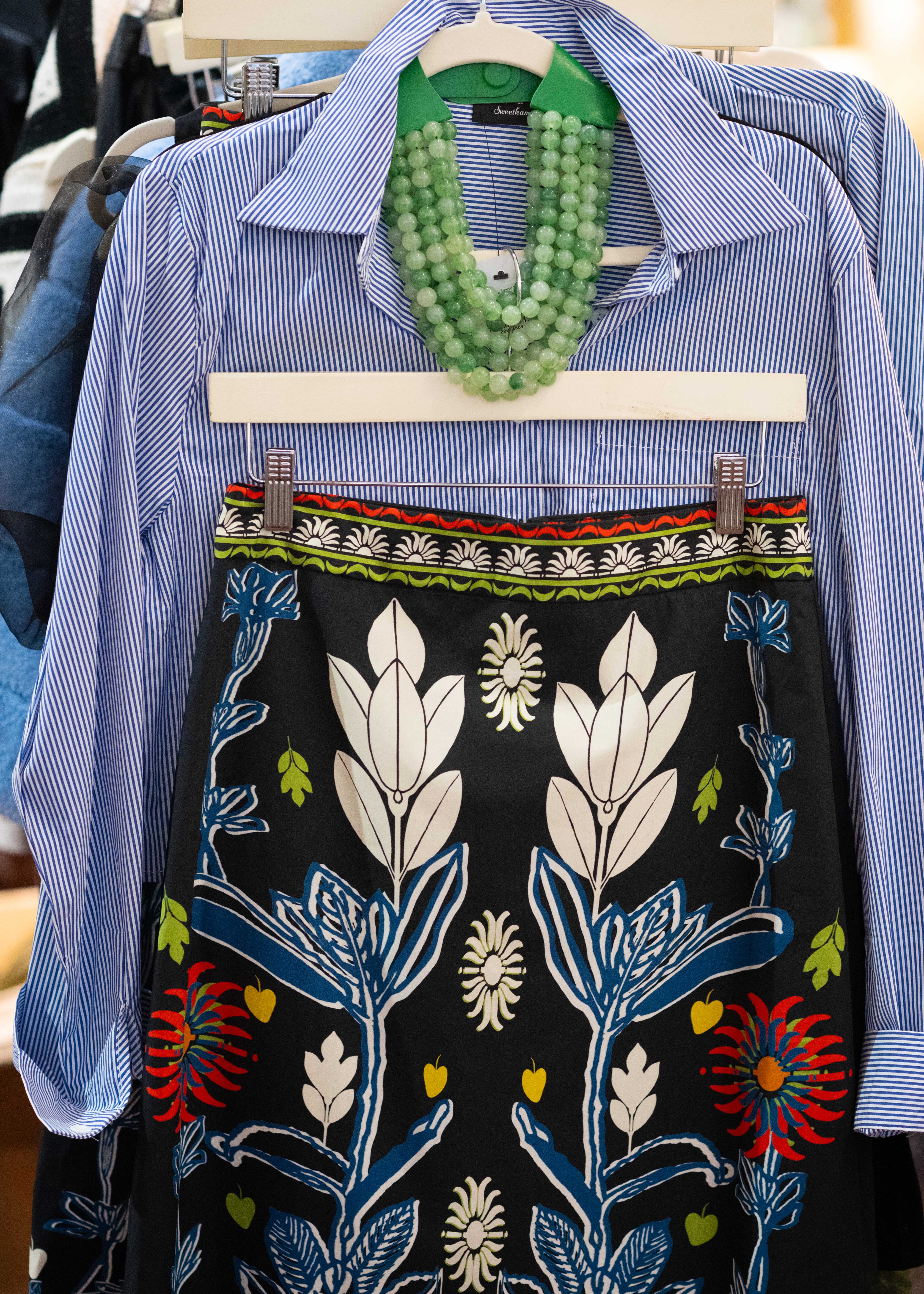 Lightweight printed ladies skirt featuring black background with large abstract white flowers, blue pedals, and accents of red, yellow and green. The waistband has a striped floral design in red, white and green.