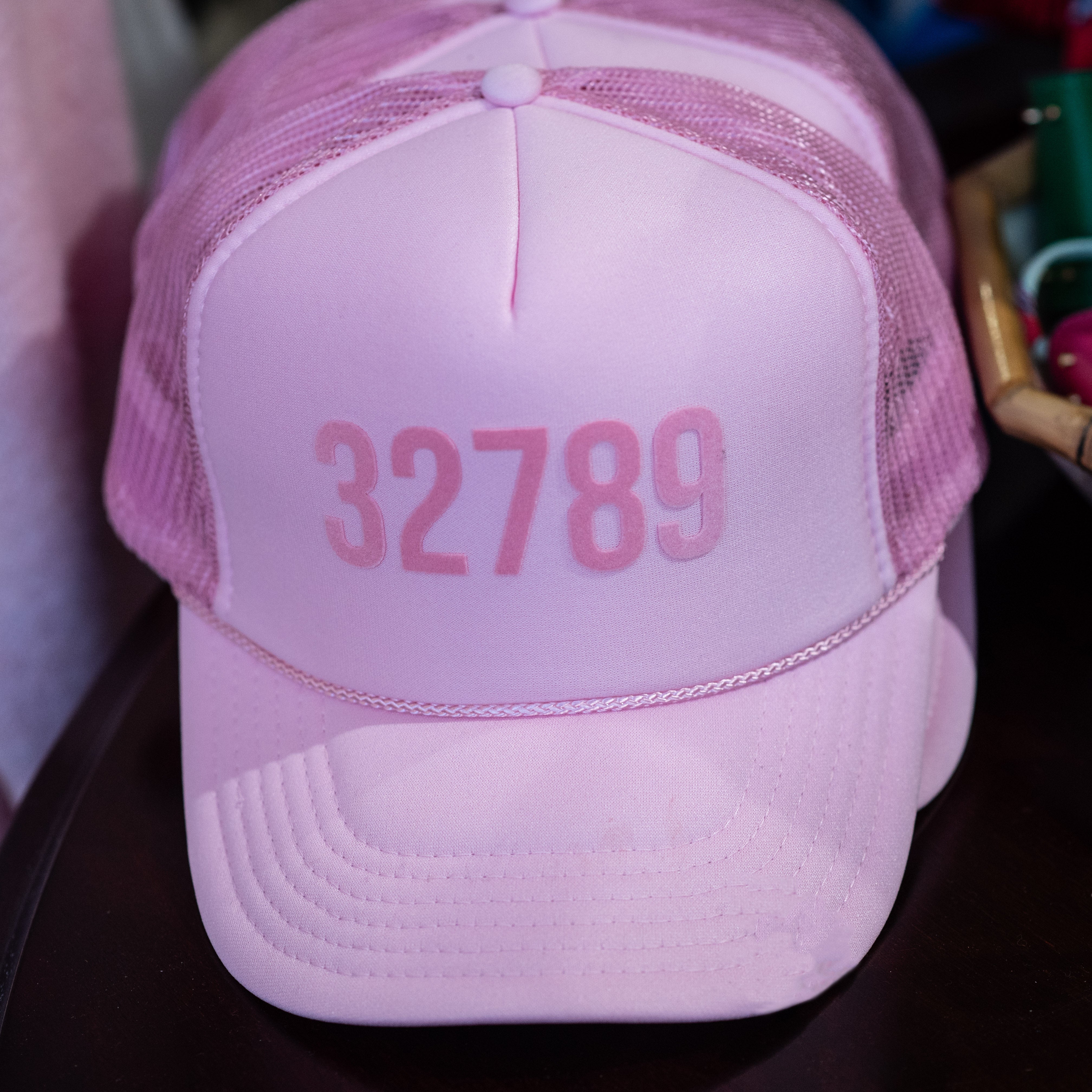 Two-tone pink trucker hat with numbers "32789" Winter Park zip code printed on the front.