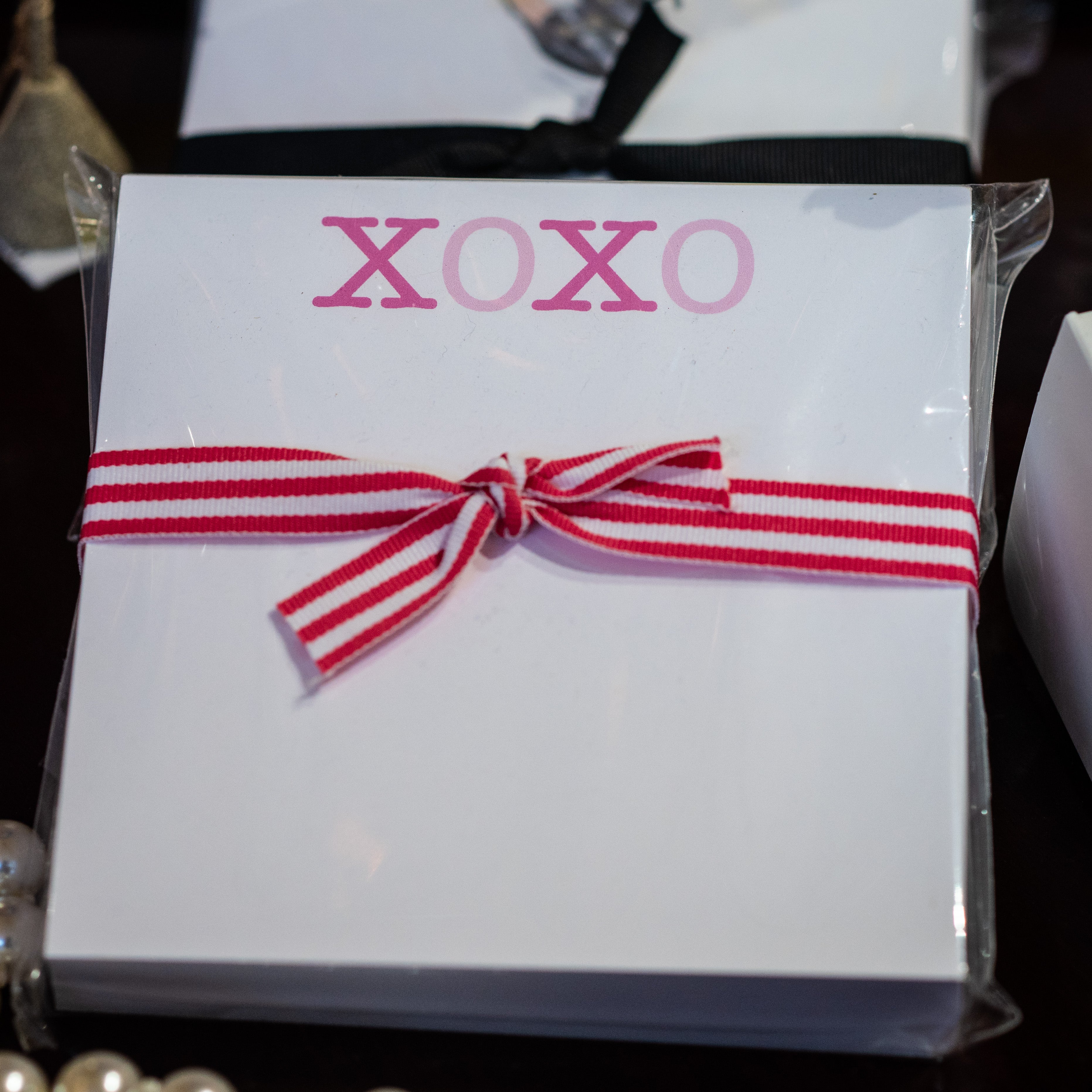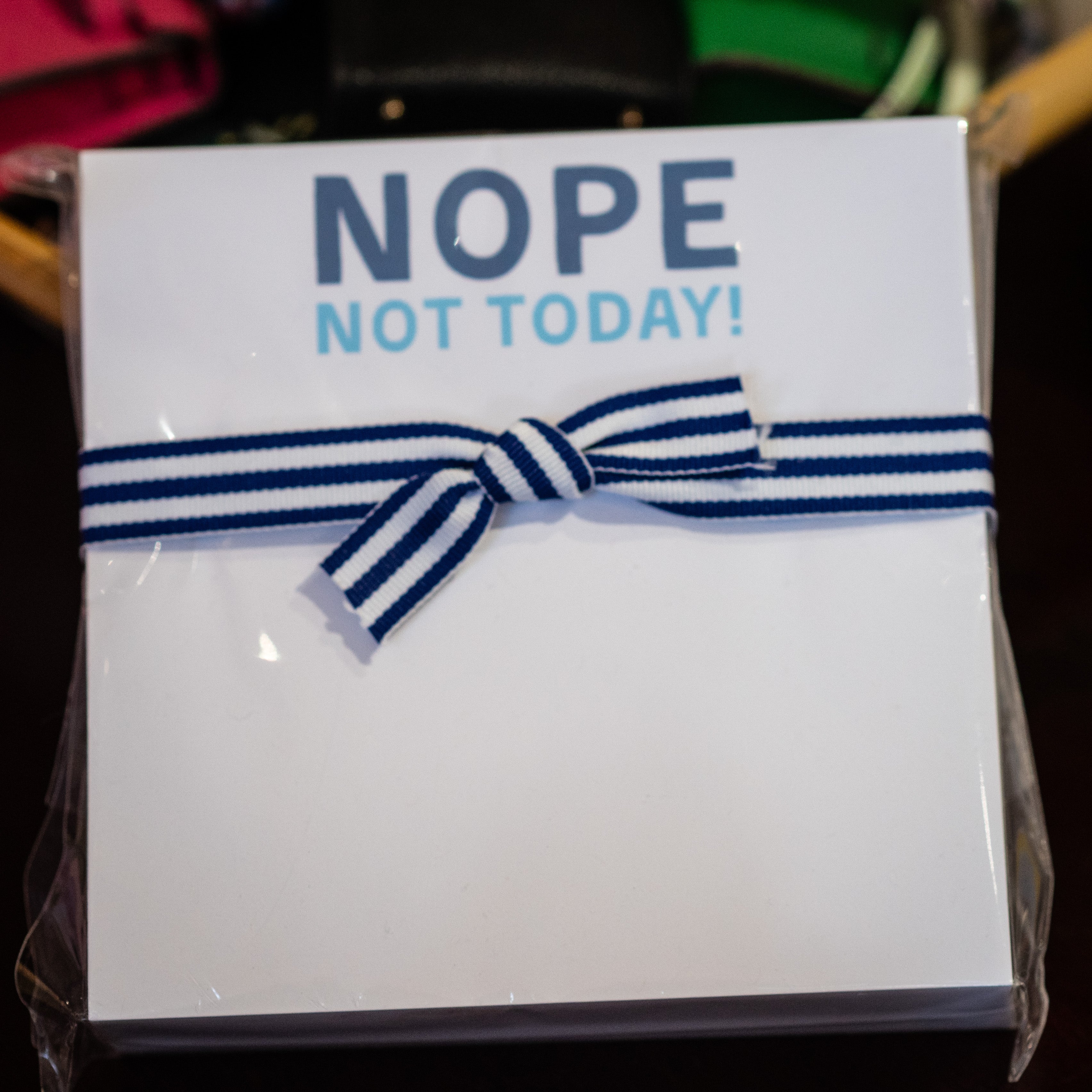 Large square notepads with matching striped ribbon with the sayings "XOXO", "Nope, Not Today", and "Horsebit Lovers".