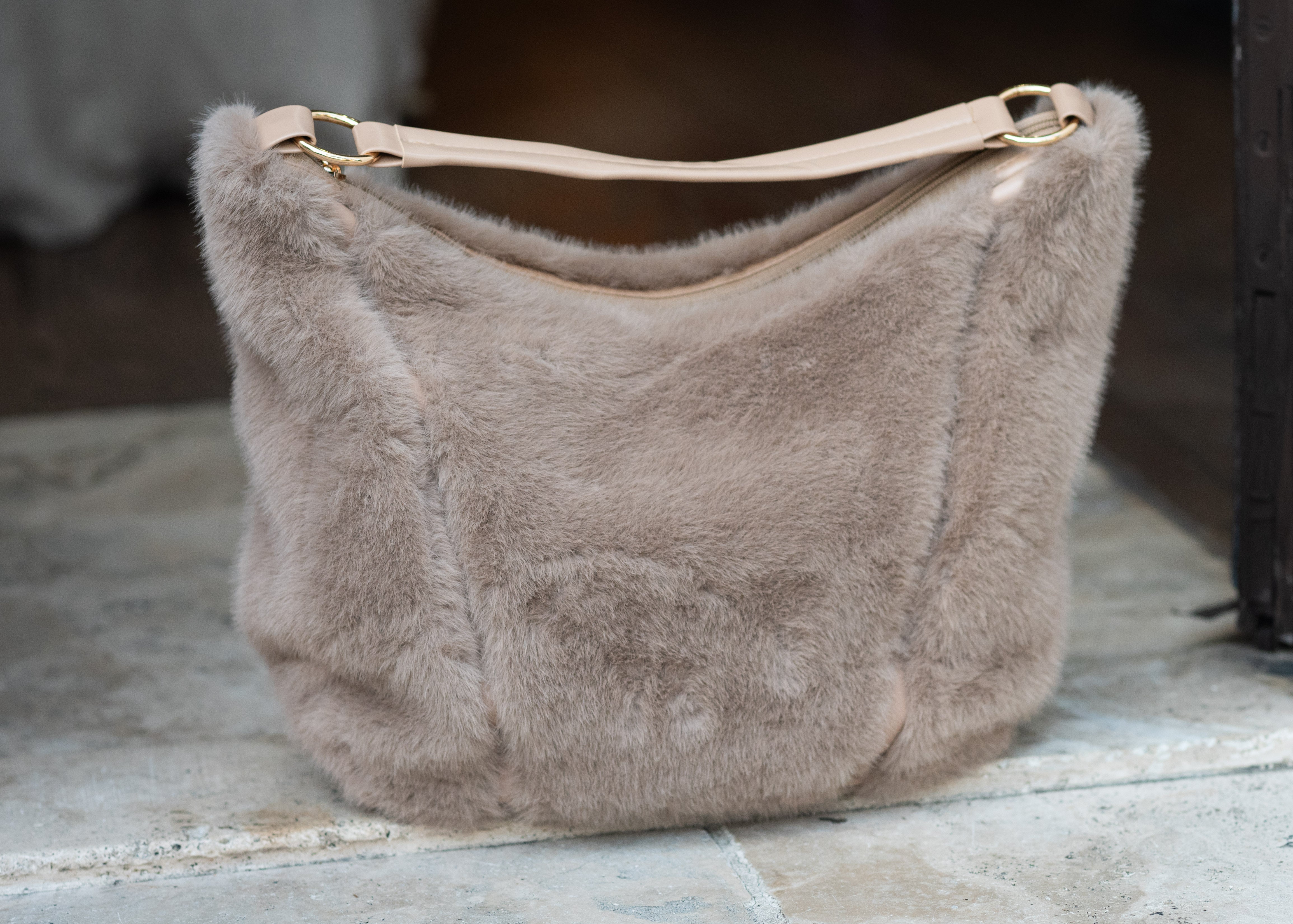 Khaki faux mink tote bag featuring faux mink exterior and one strap.