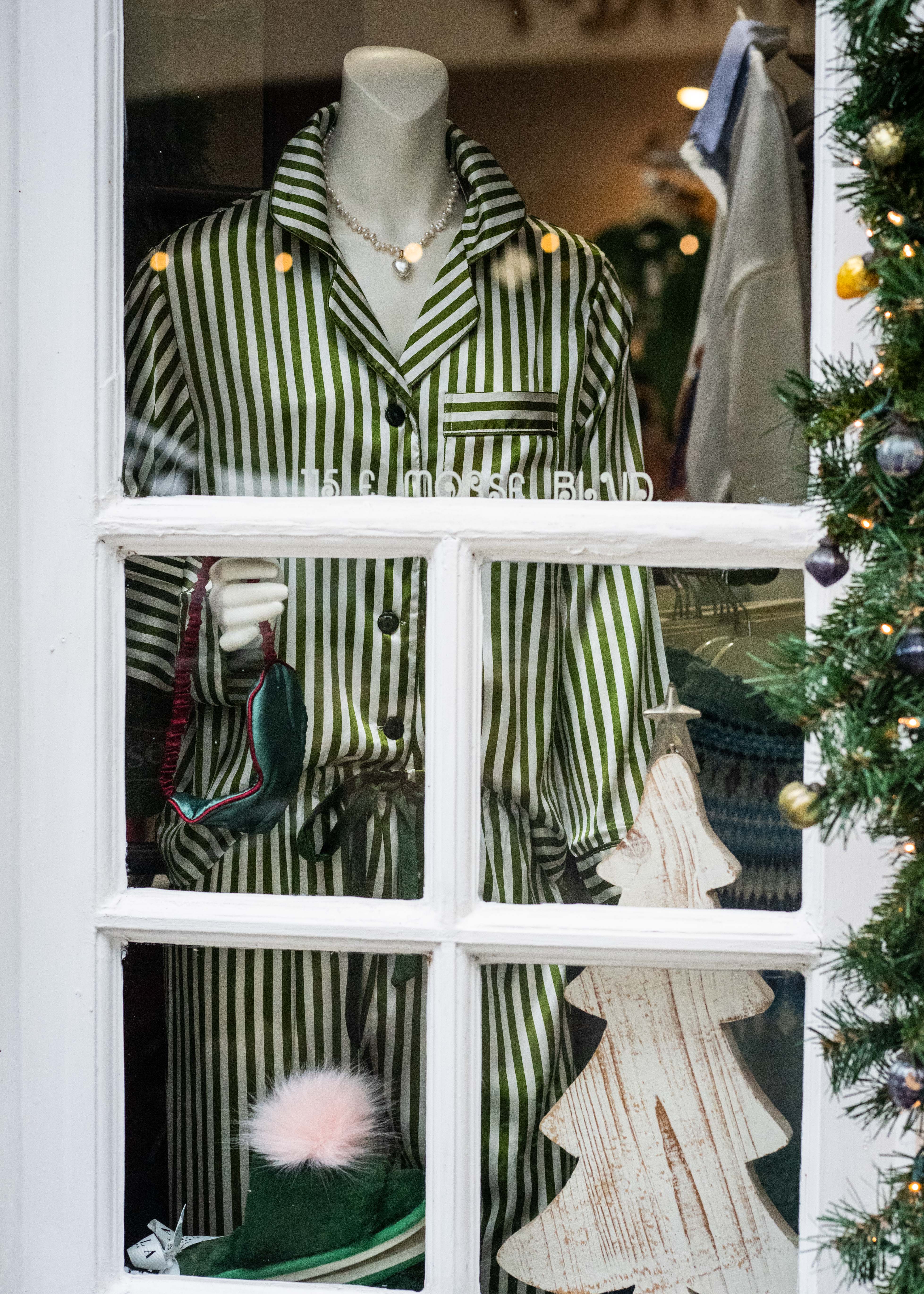 Green and white striped satin ladies pajama set.