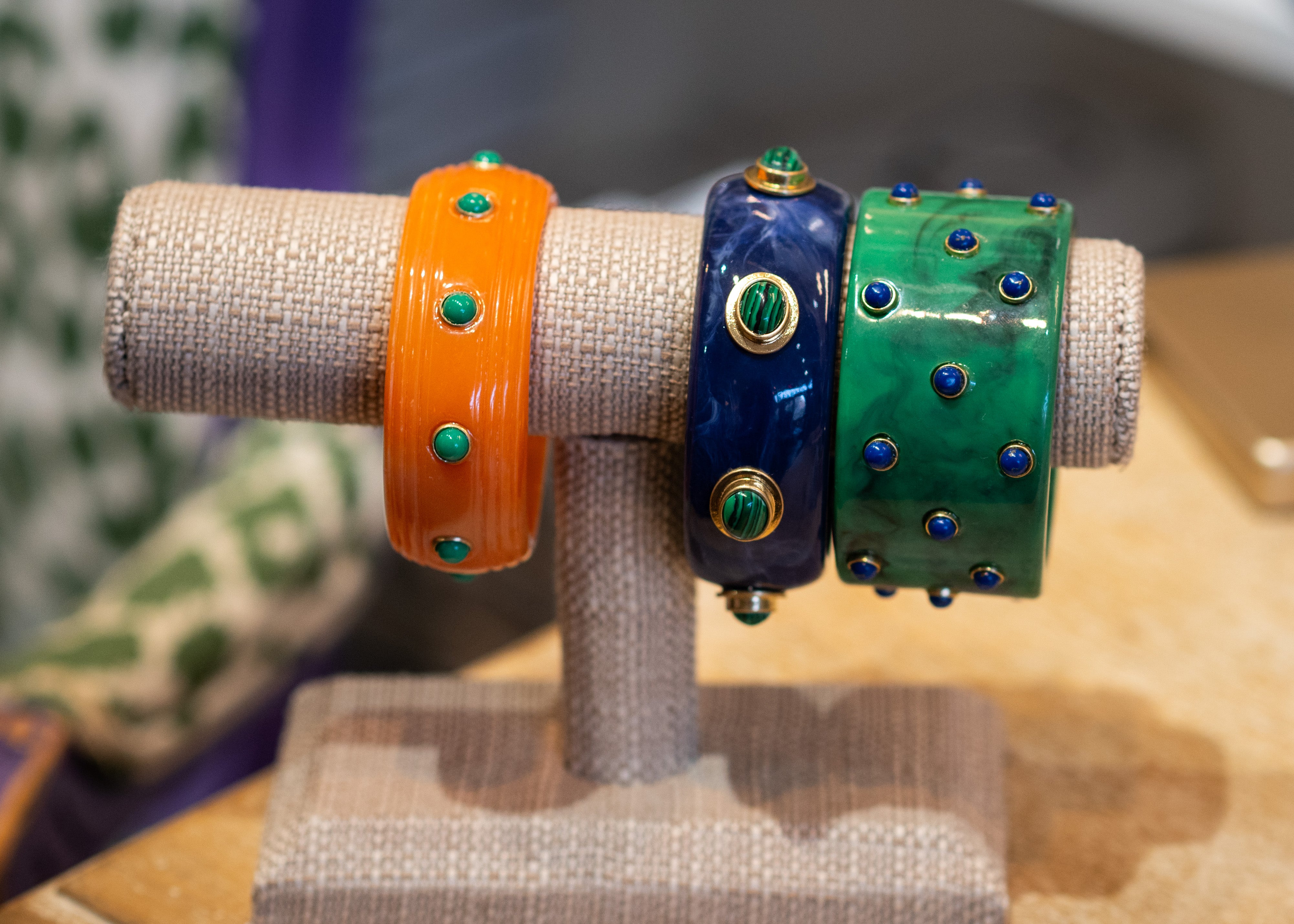 Orange resin oversized bangle bracelet with bezel set turquoise stones.