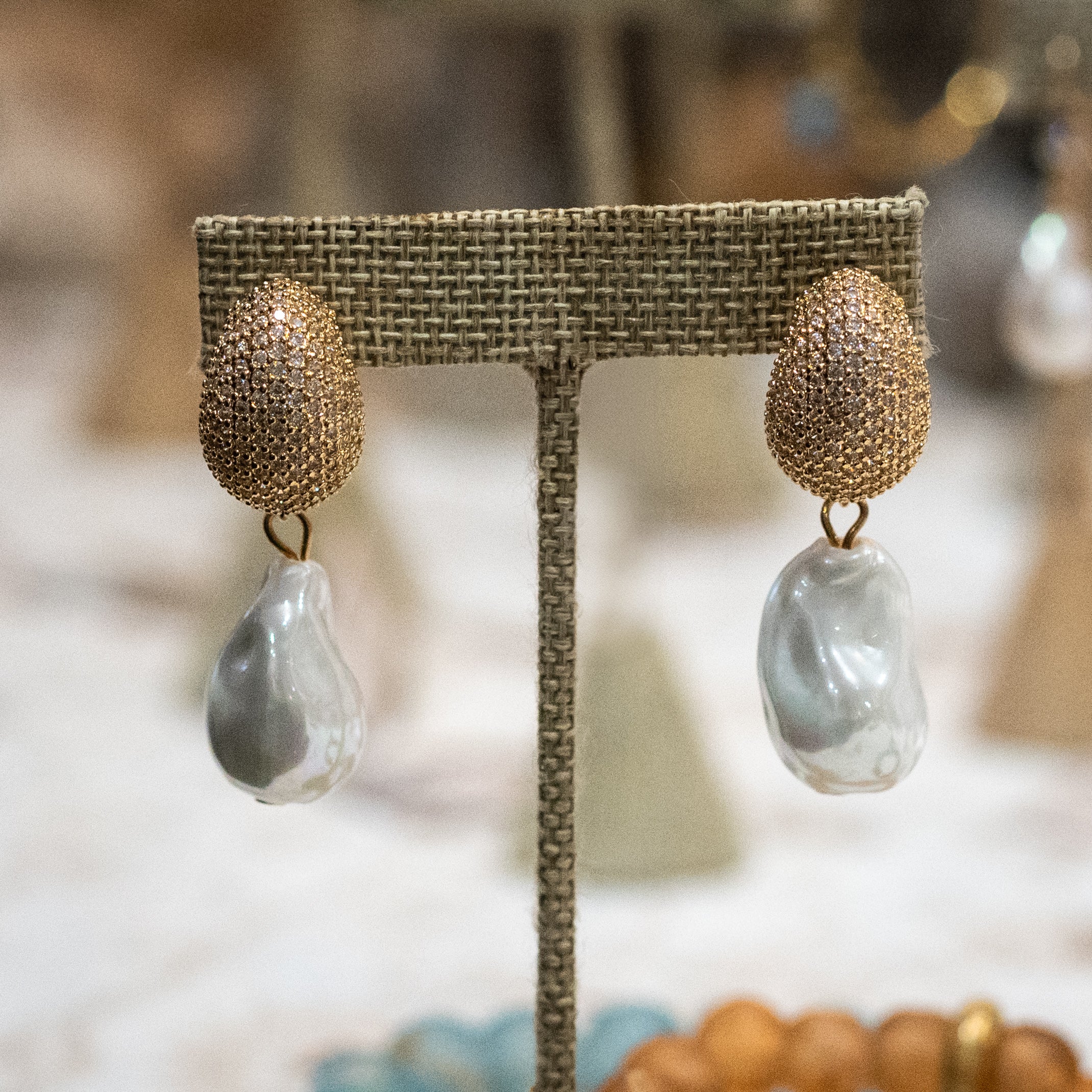 Natural pearl drop earrings featuring a rhinestone half oval post and a pearl drop.