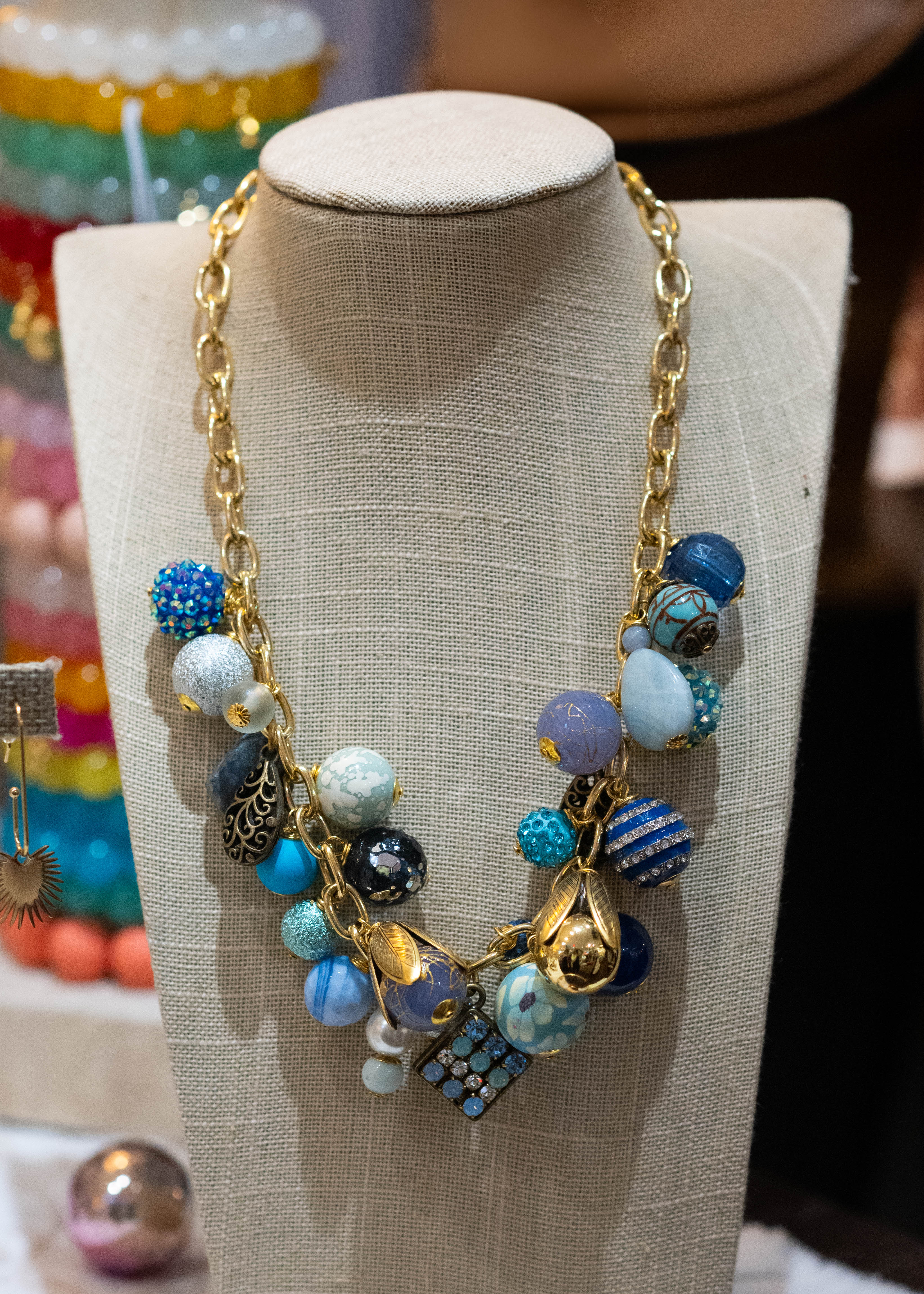 Large gold chain link necklace with assorted large bead charms in shades of blue, turquoise and pearl, etc.