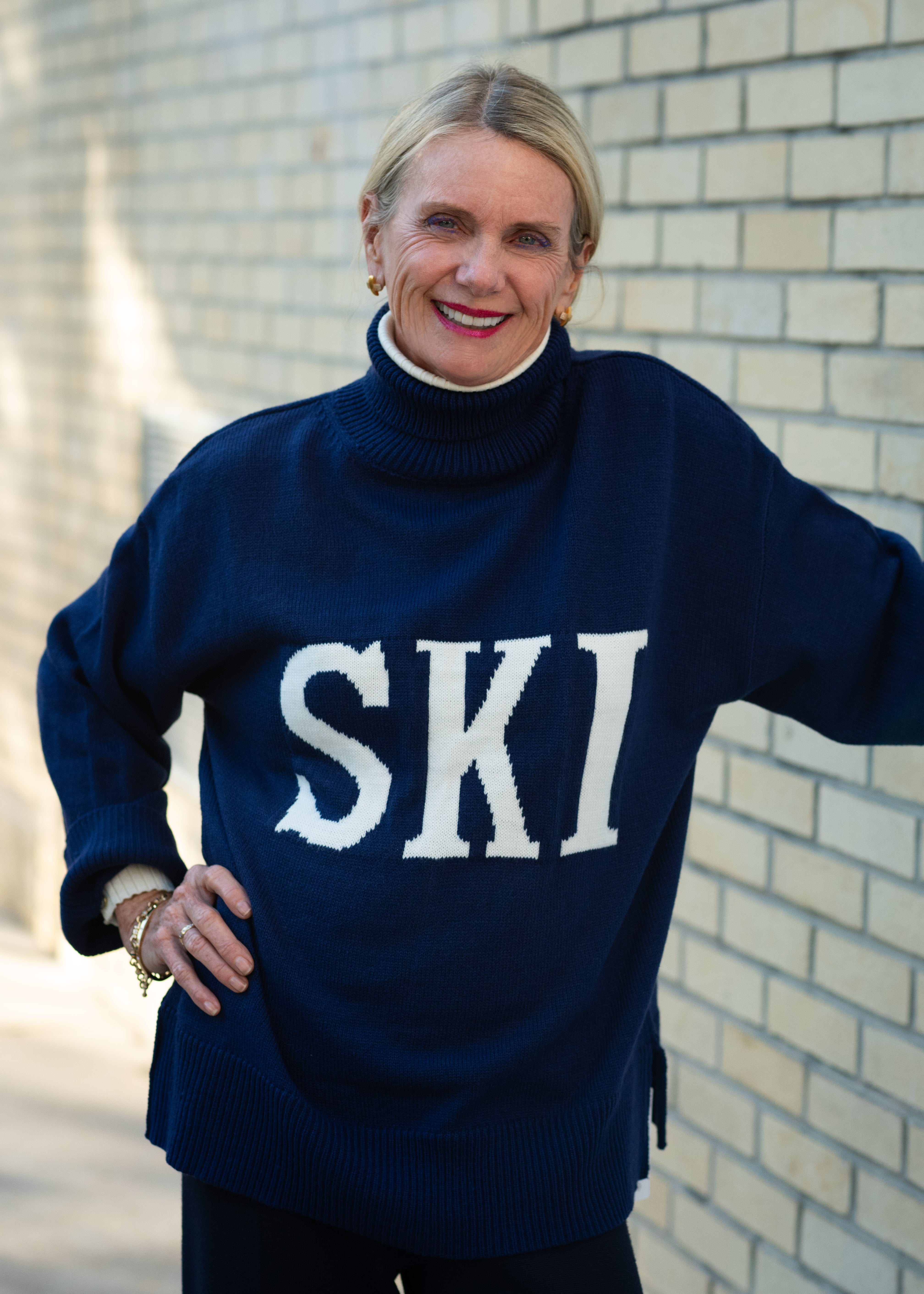 Navy blue cotton turtle neck sweater with large white letters "SKI" in the middle.