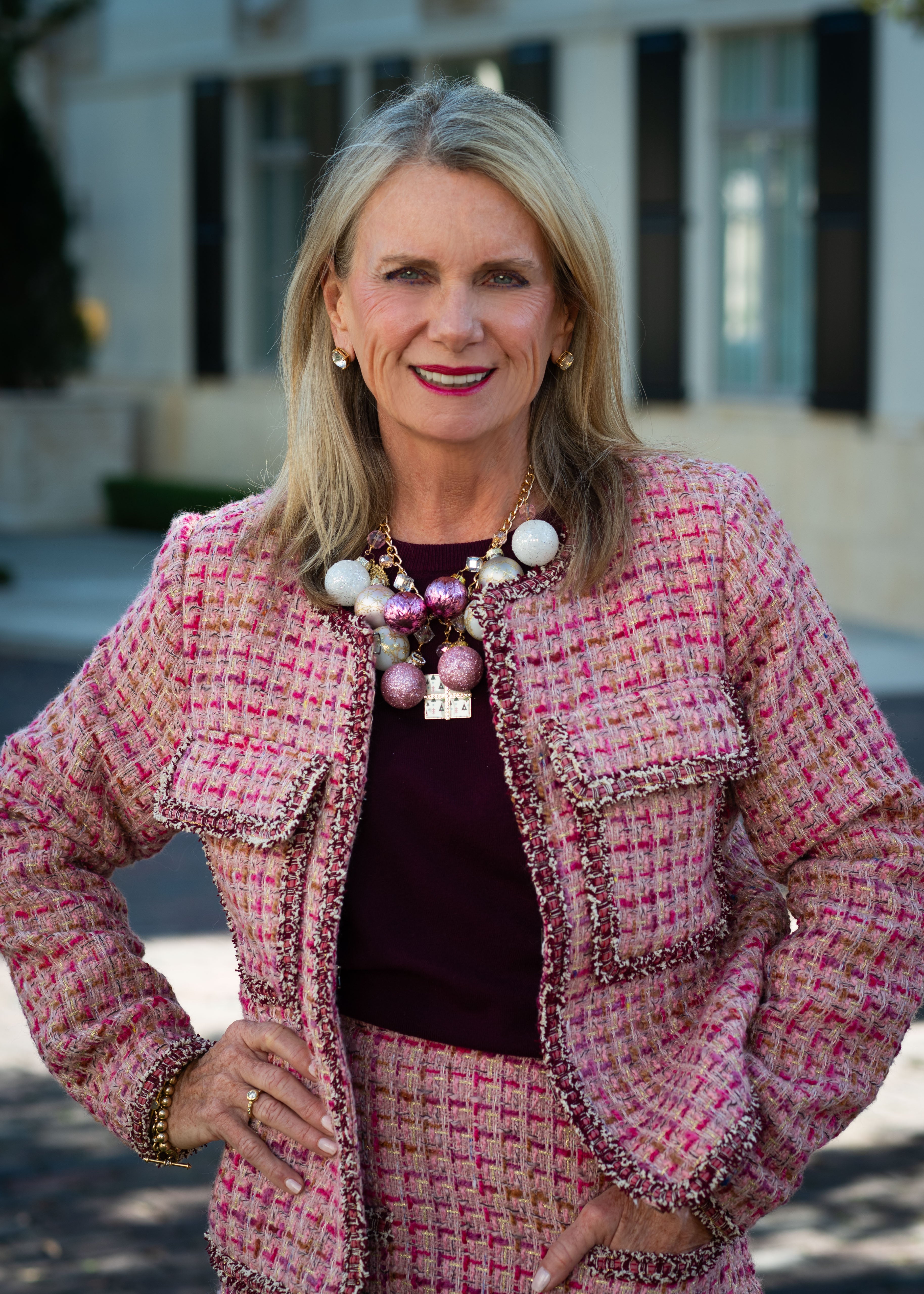 Multi-tone pink tweed plaid open front jacket with front patch pockets. Pockets and jacket opening and sleeves are all embellished with decorative gold metallic trim. The coordinating short skirt is available.