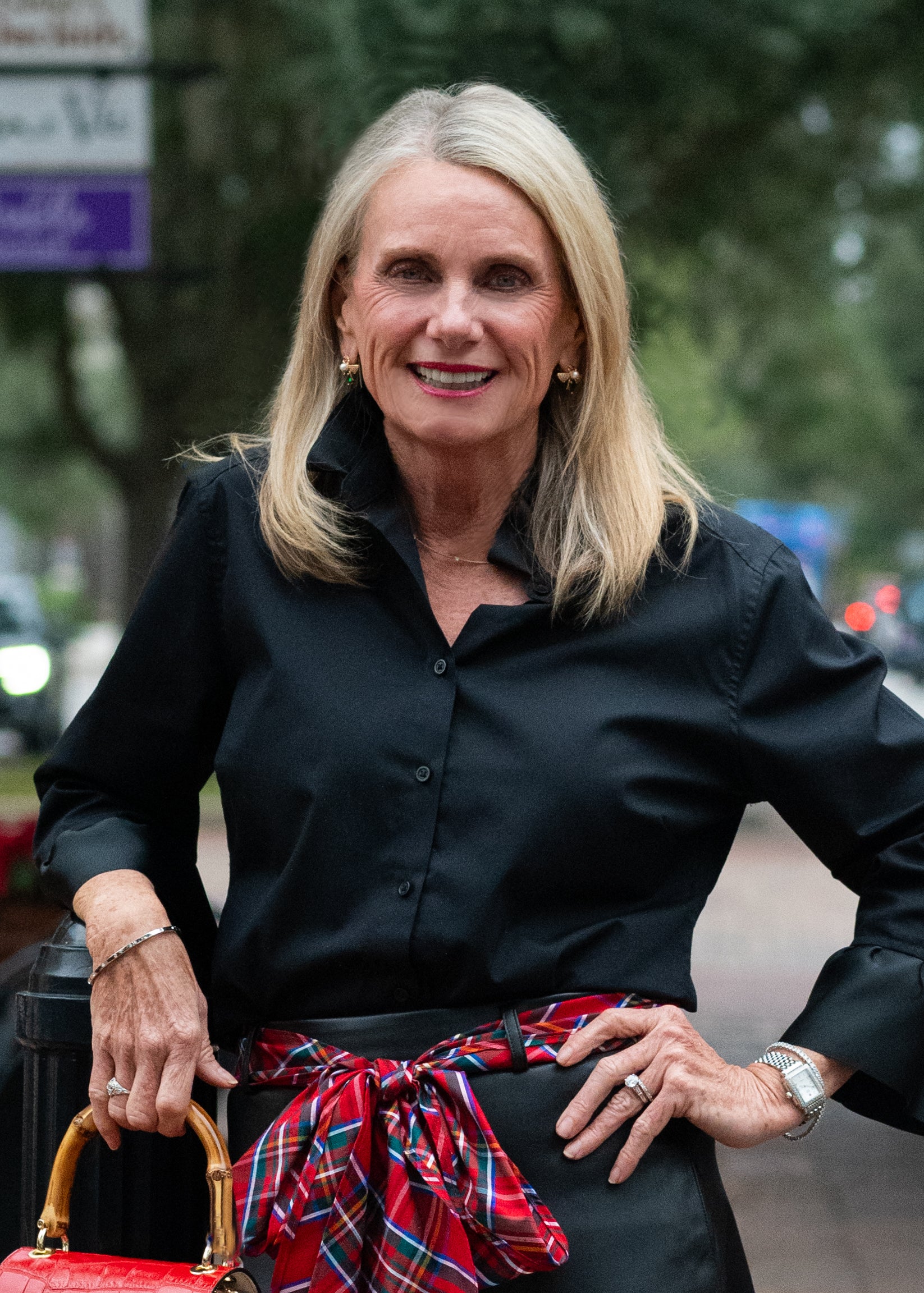 Crisp button-down blouse with bell cuff sleeves and grosgrain ribbon collar. Available in white, black and navy blue.