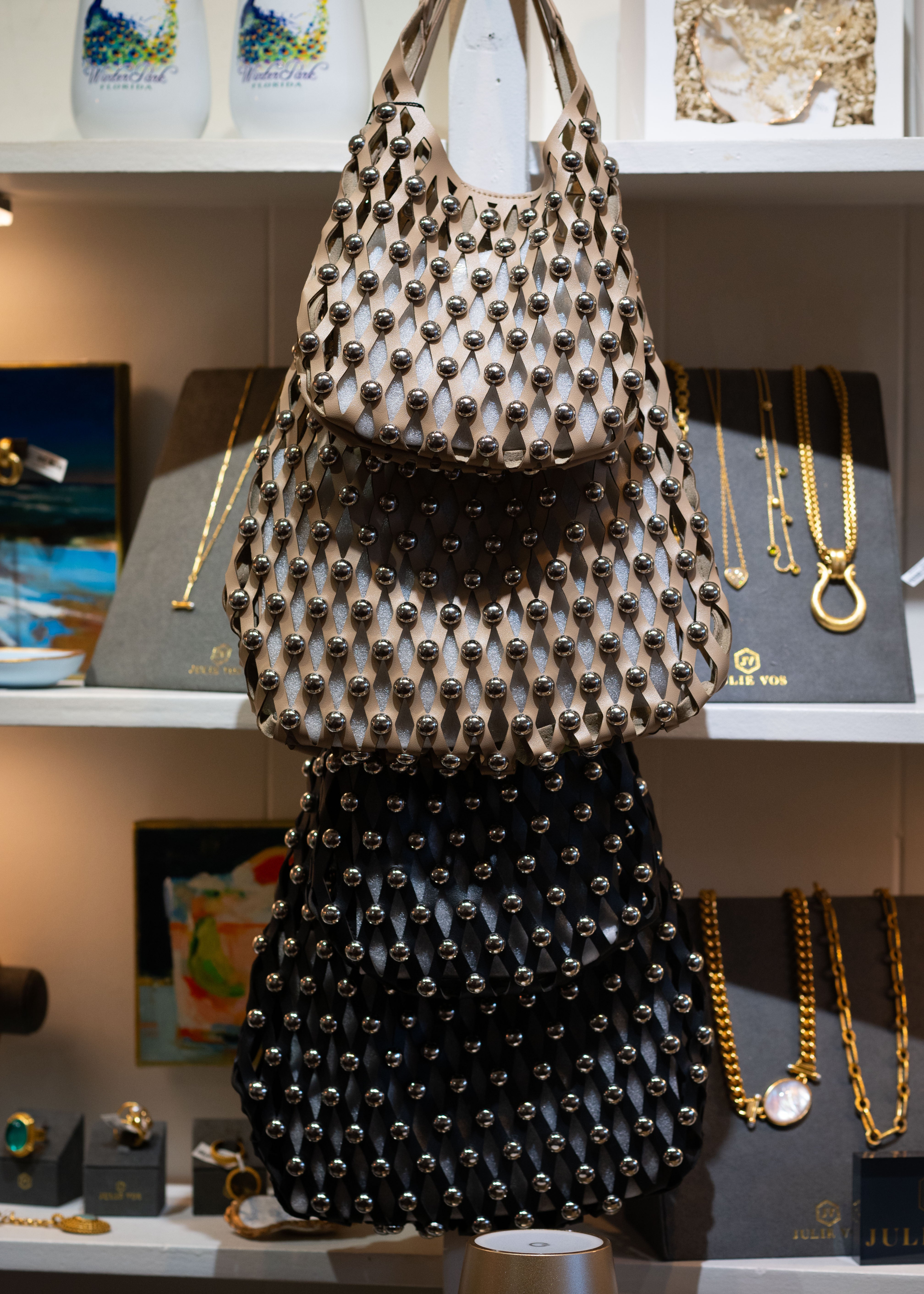 Faux leather open weave handbag with metallic grommets at each cross. Available in black, taupe and red. Also available in a larger size.