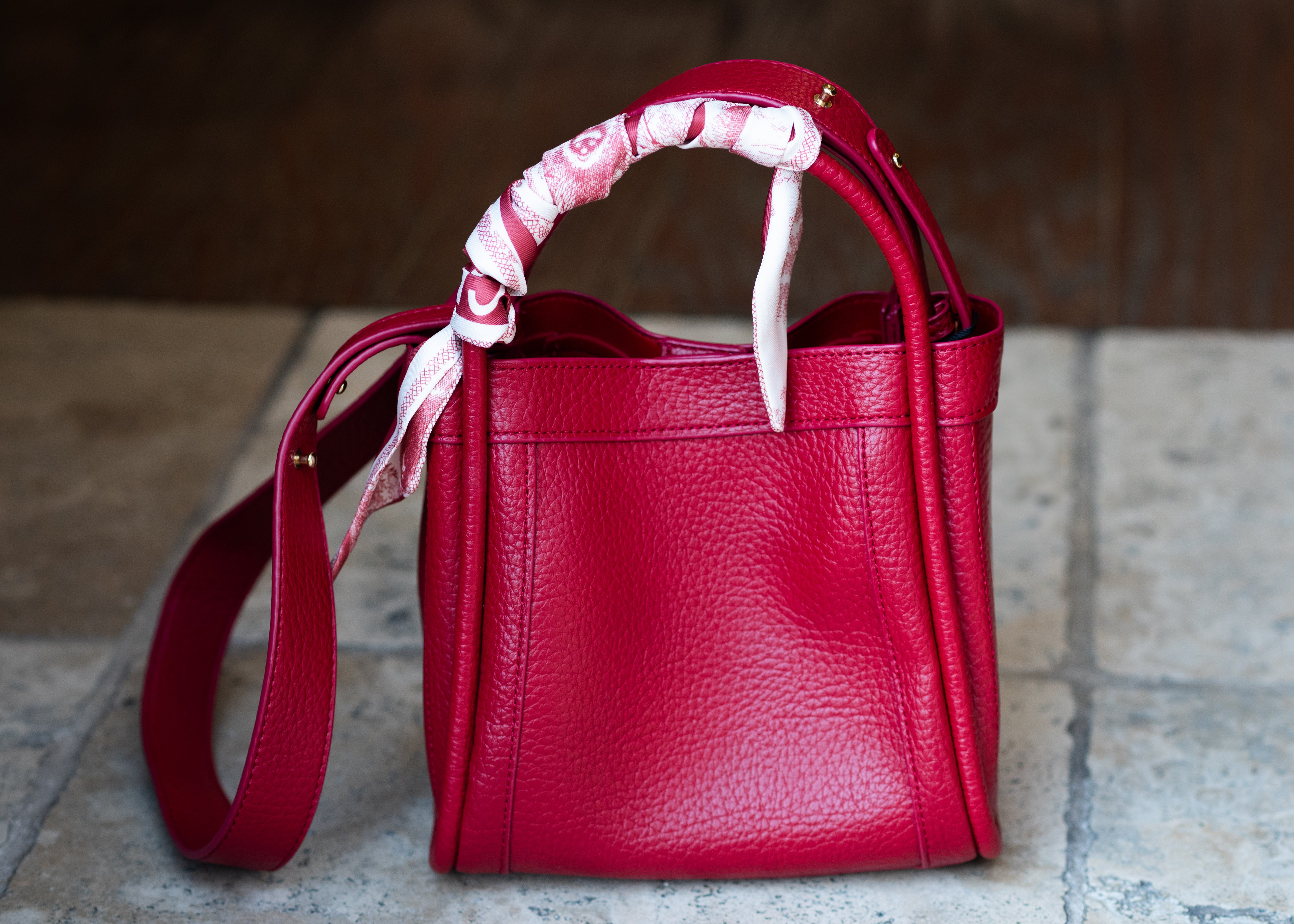 Double handled medium-sized purse featuring magnetic clasp, an additional long strap and scarf wrap. Available in burgundy and tan.