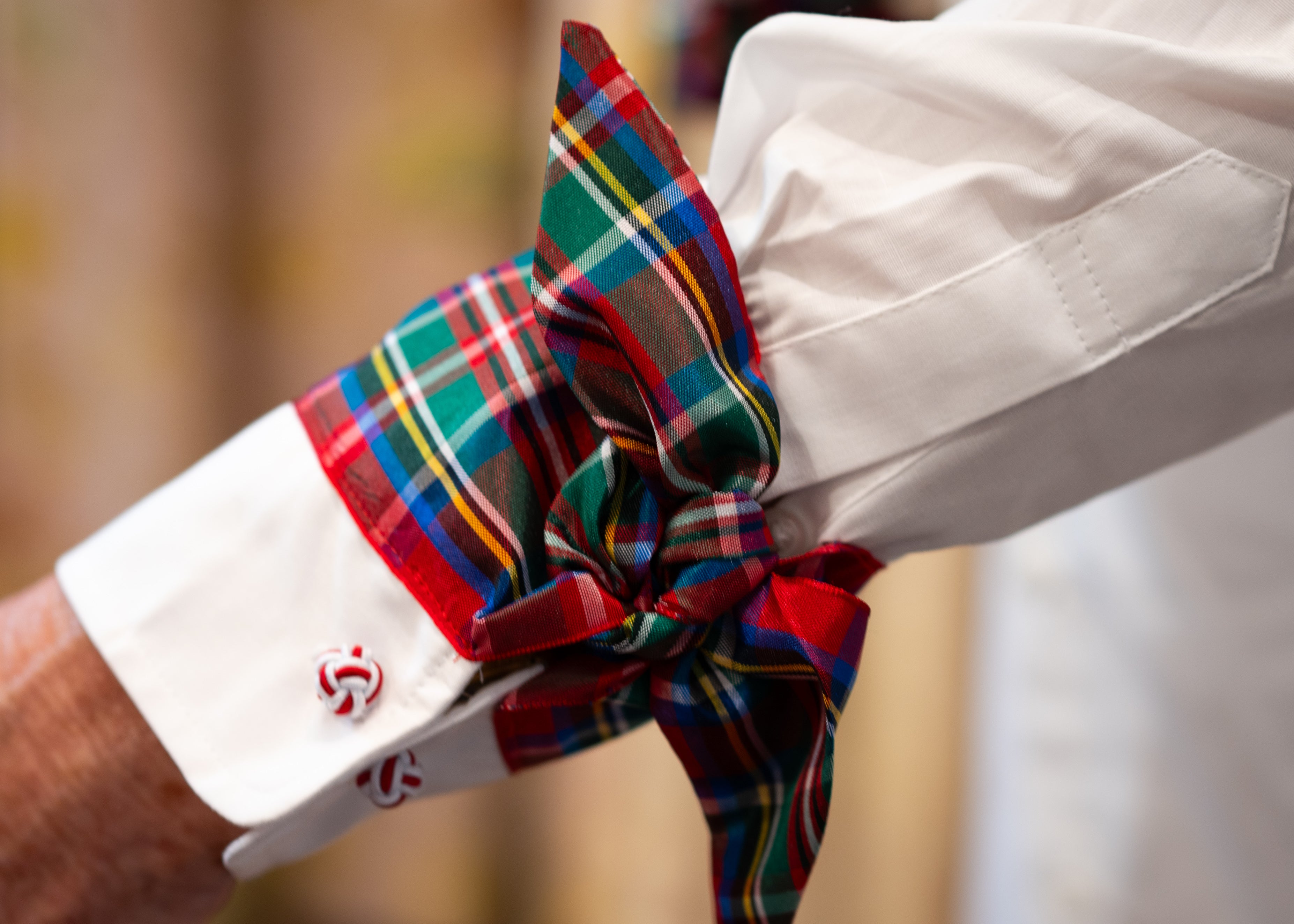 White button-down blouse with red and white ribbon collar and sleeve cuffs or Royal Steward collar and cuffs.
