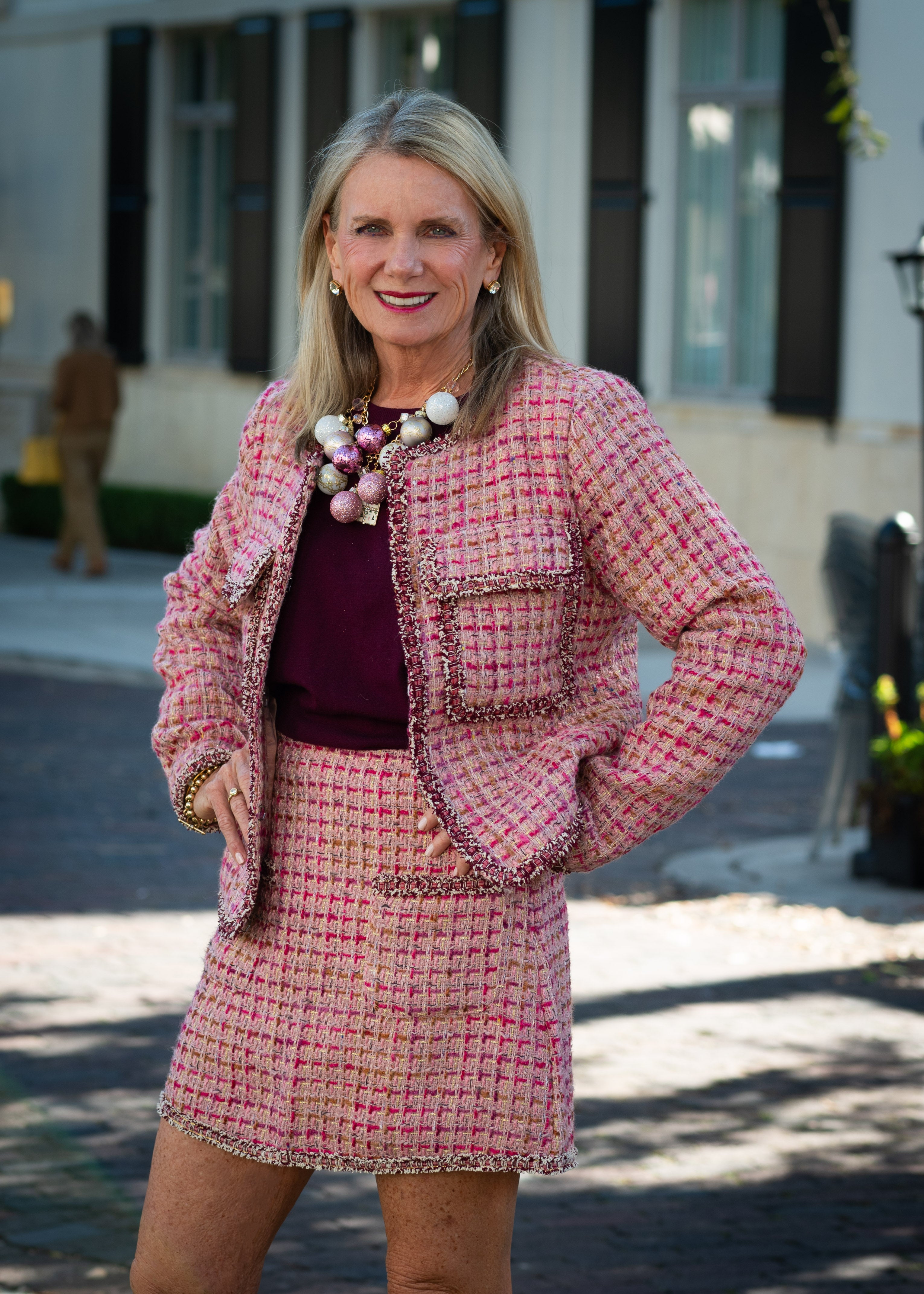 Multi-tone pink tweed plaid mini skirt with metallic embellished hem and top of patch pockets. Matching jacket is available.